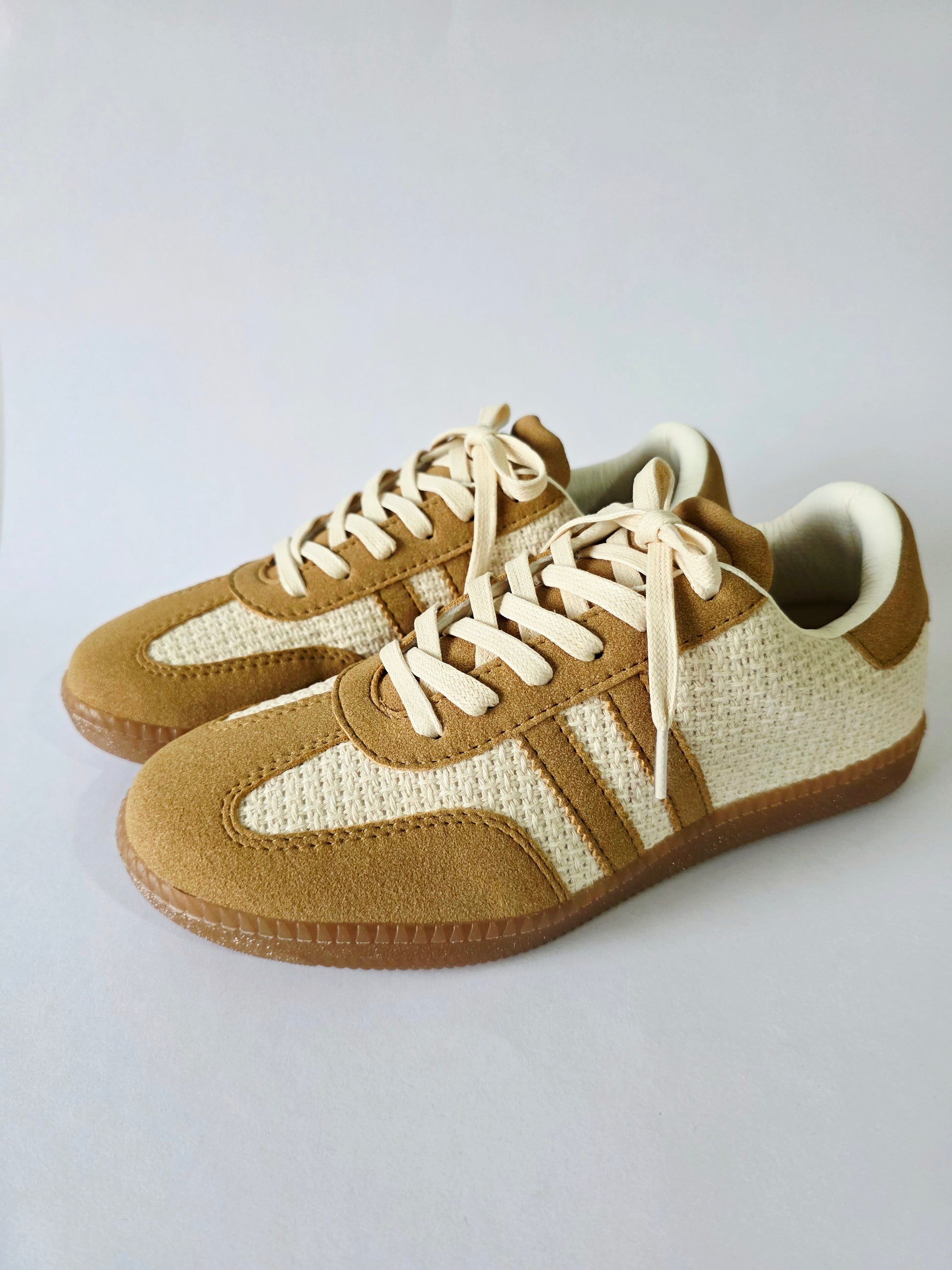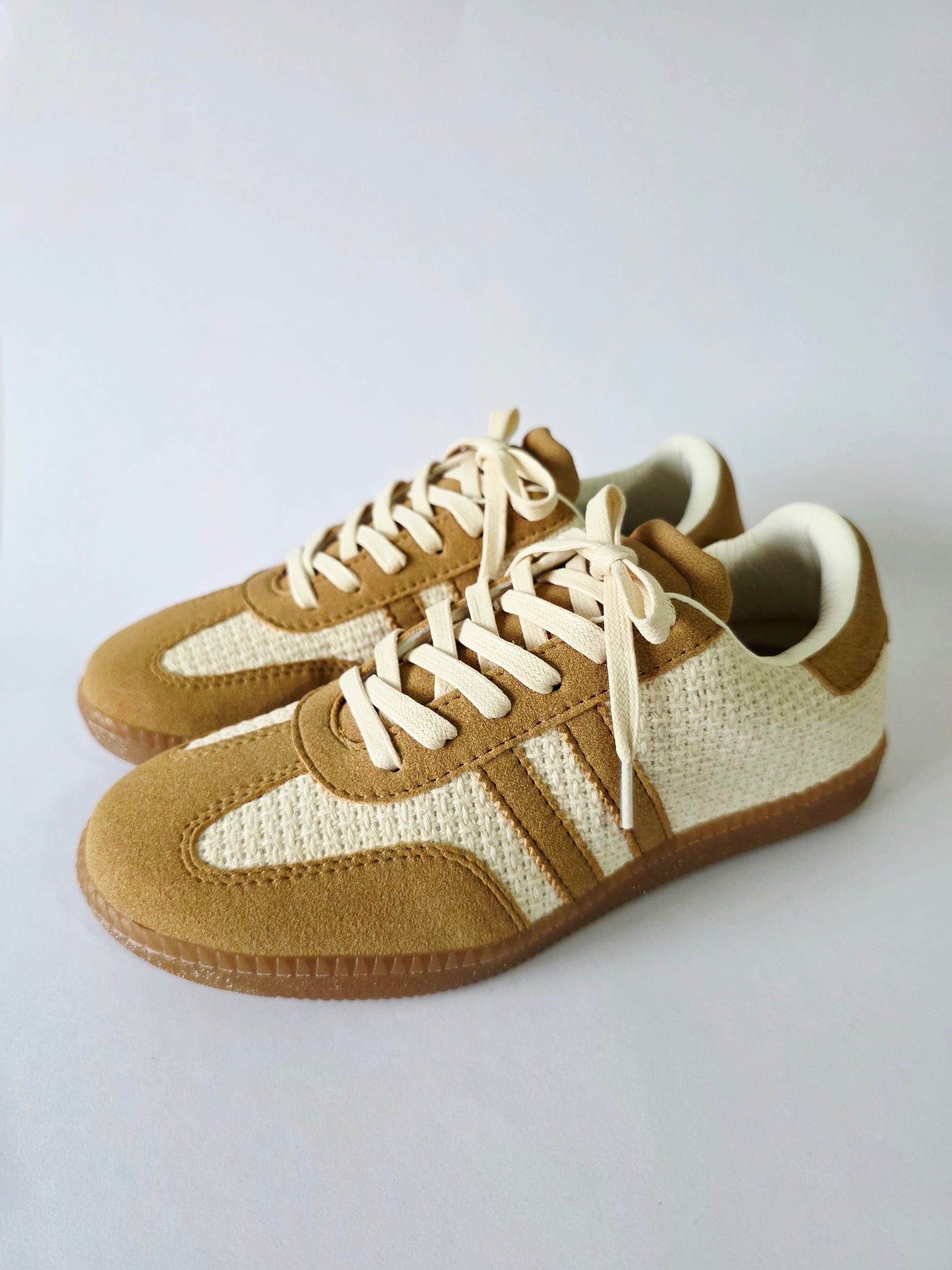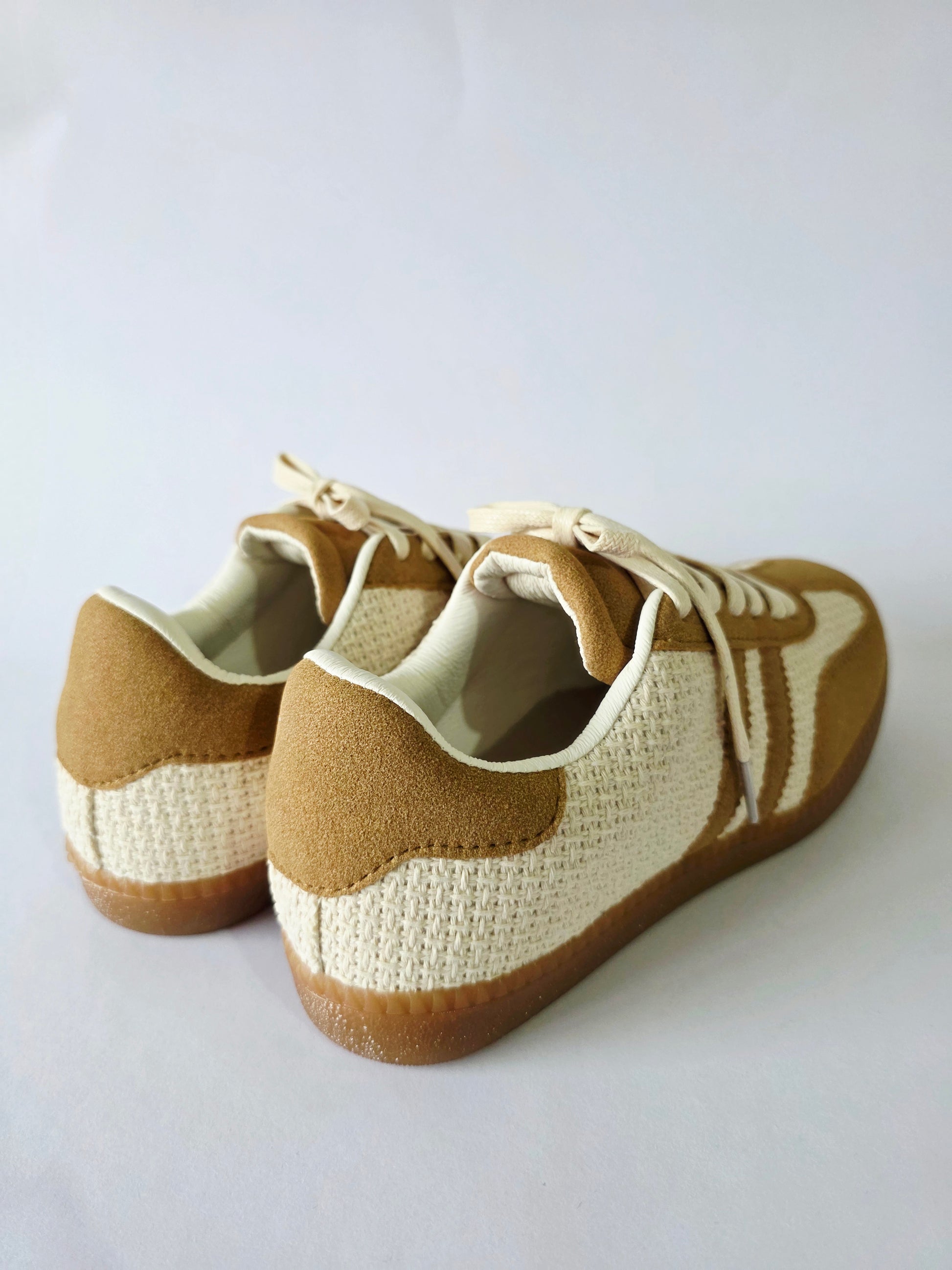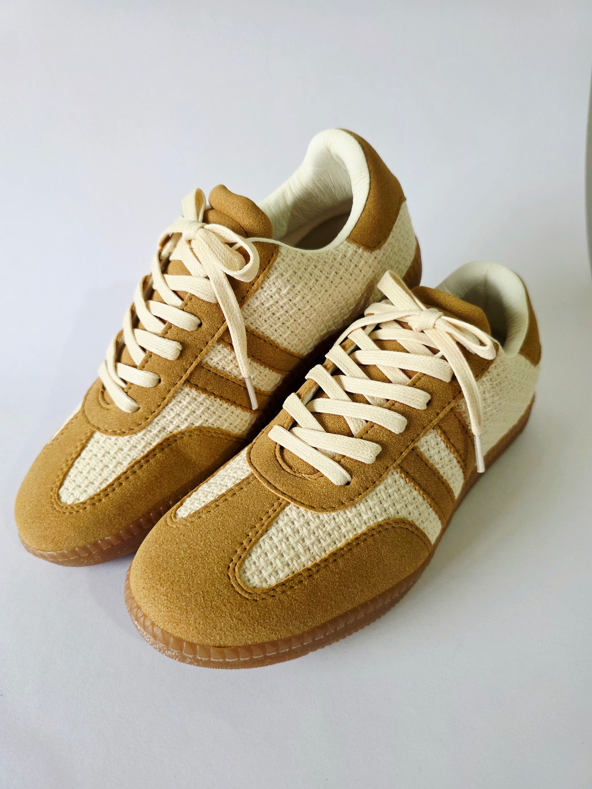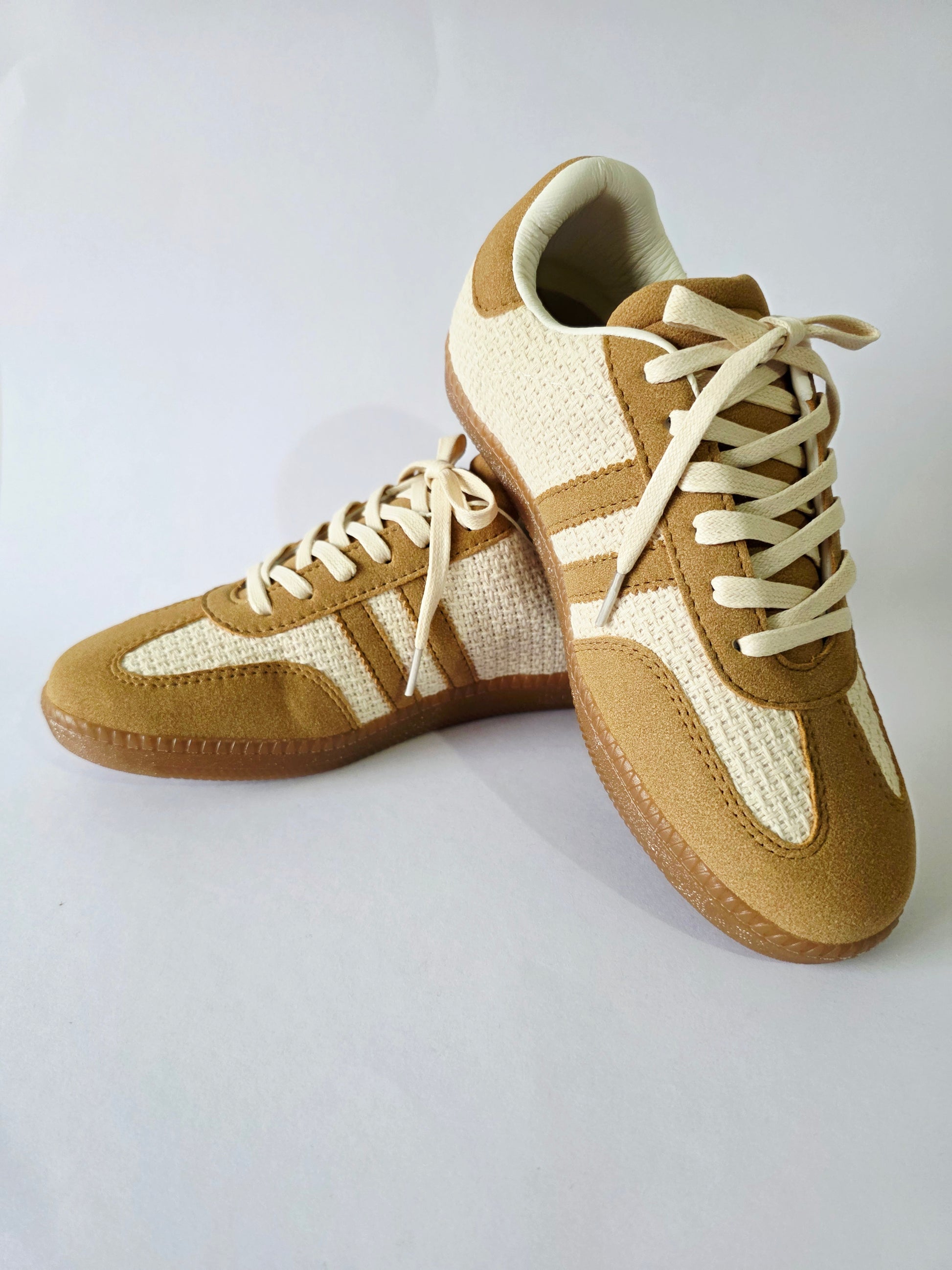 Estos tennis en gamuza camel con cuerpo en tejido tipo croché crudo, son la definición perfecta de estilo natural y versatilidad. El contraste entre la textura suave de la gamuza y el tejido fresco en tono beige crea un diseño único, ligero y moderno, ideal para quienes buscan un calzado cómodo pero con mucha personalidad.