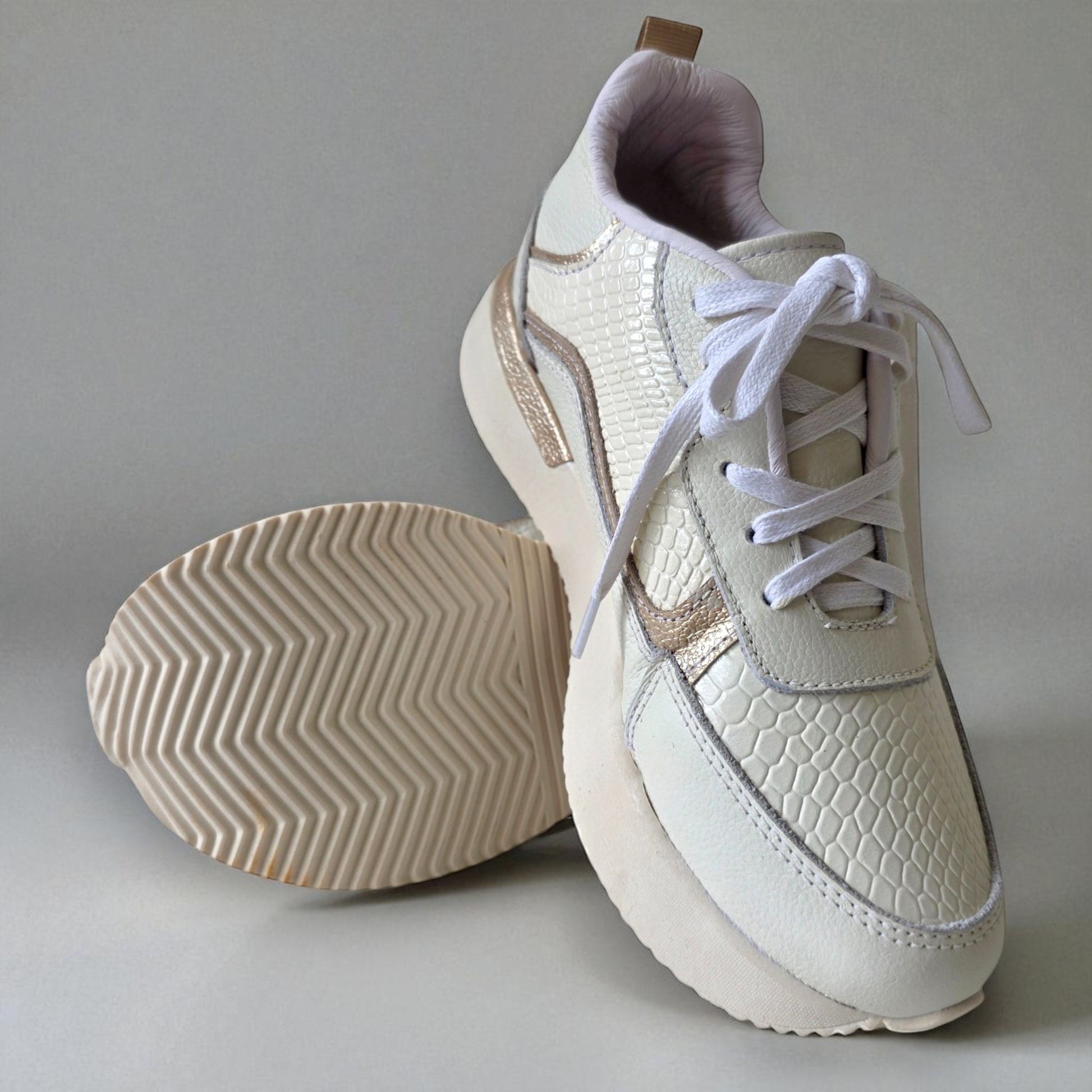 Diseñados para mujeres que aprecian el detalle, el modelo Brisa te envuelve en lujo sin exageraciones. La textura tipo pitón en blanco y los acentos metálicos dorados elevan cualquier atuendo, mientras que la suela robusta brinda comodidad y seguridad.