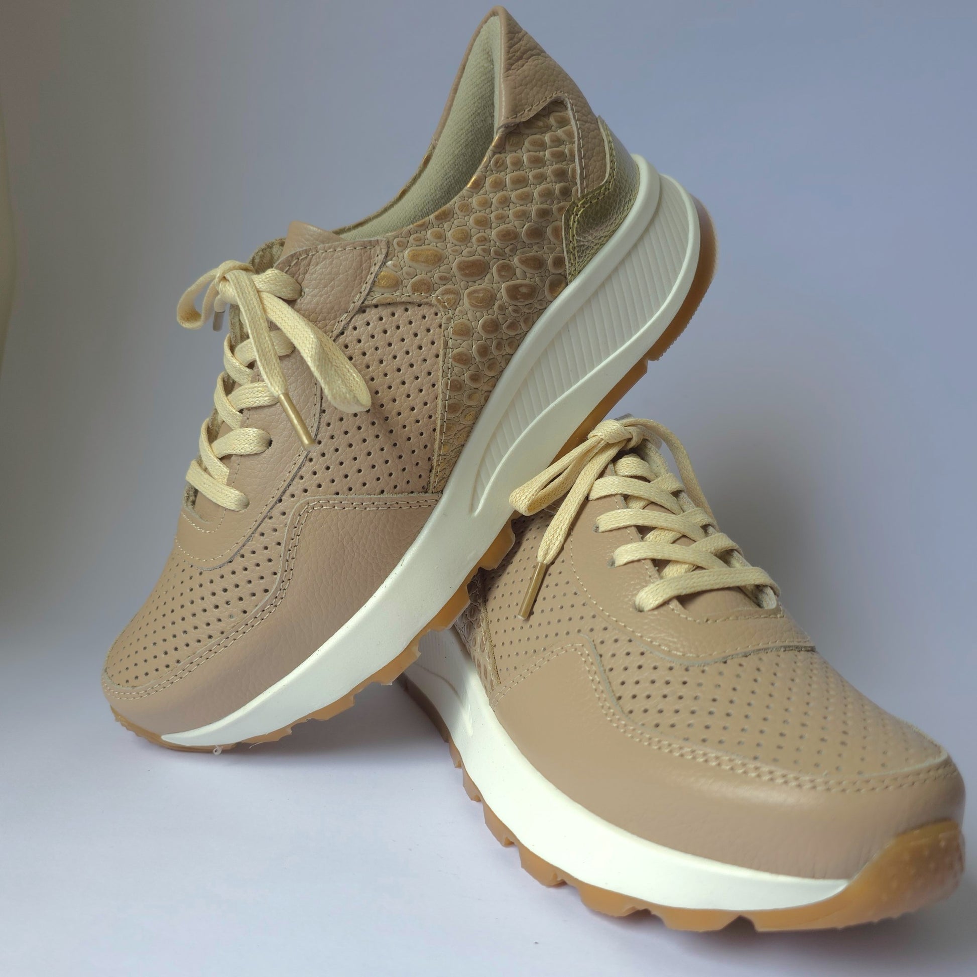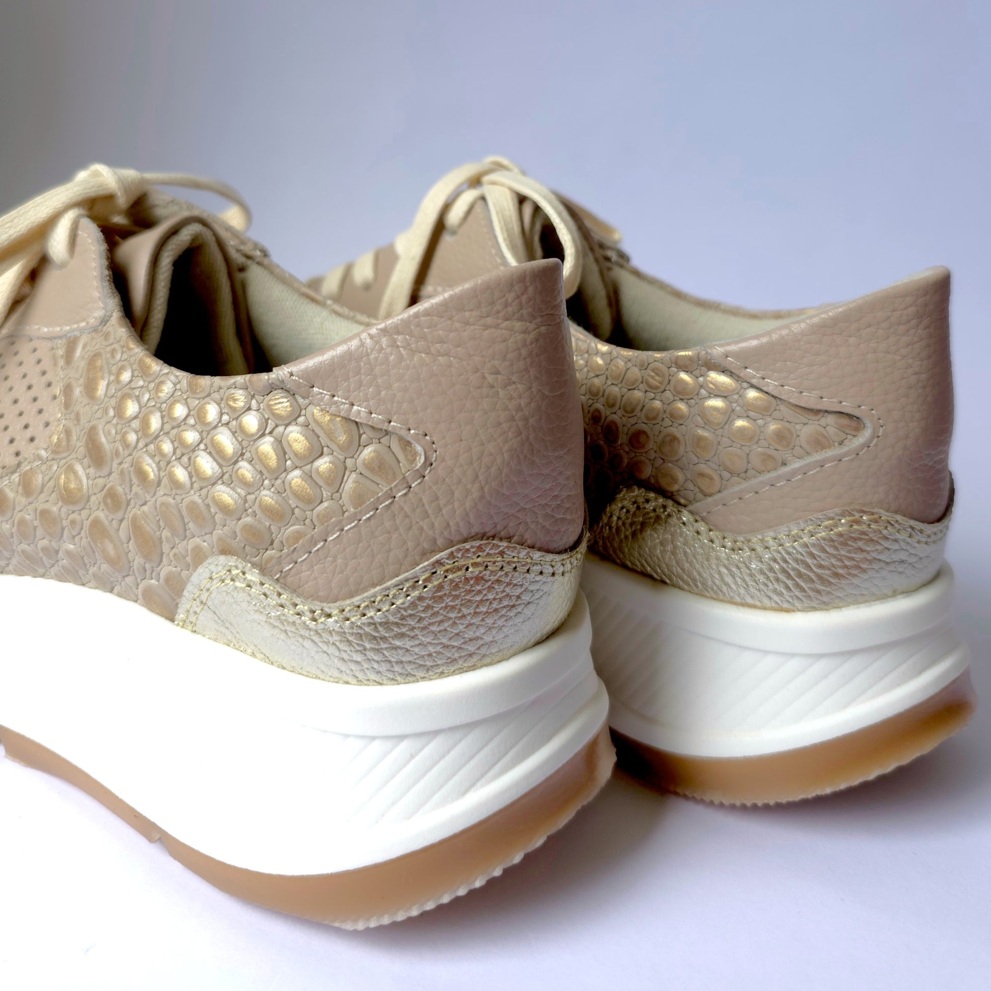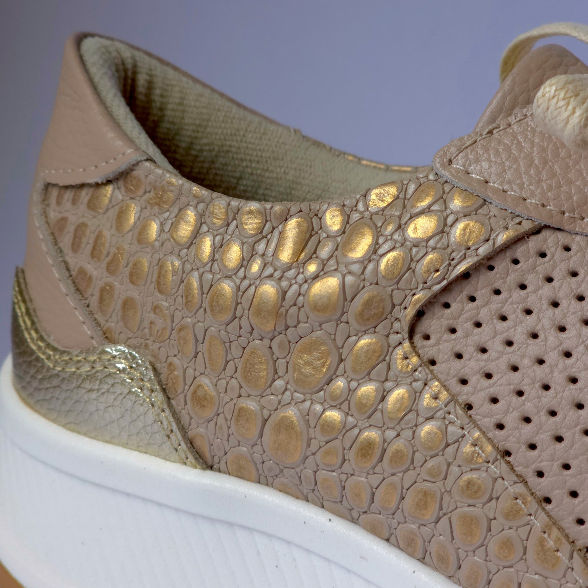 Resalta tu estilo con estos tennis de cuero taupe / Nude con detalles dorados que combinan modernidad y elegancia en un solo diseño.