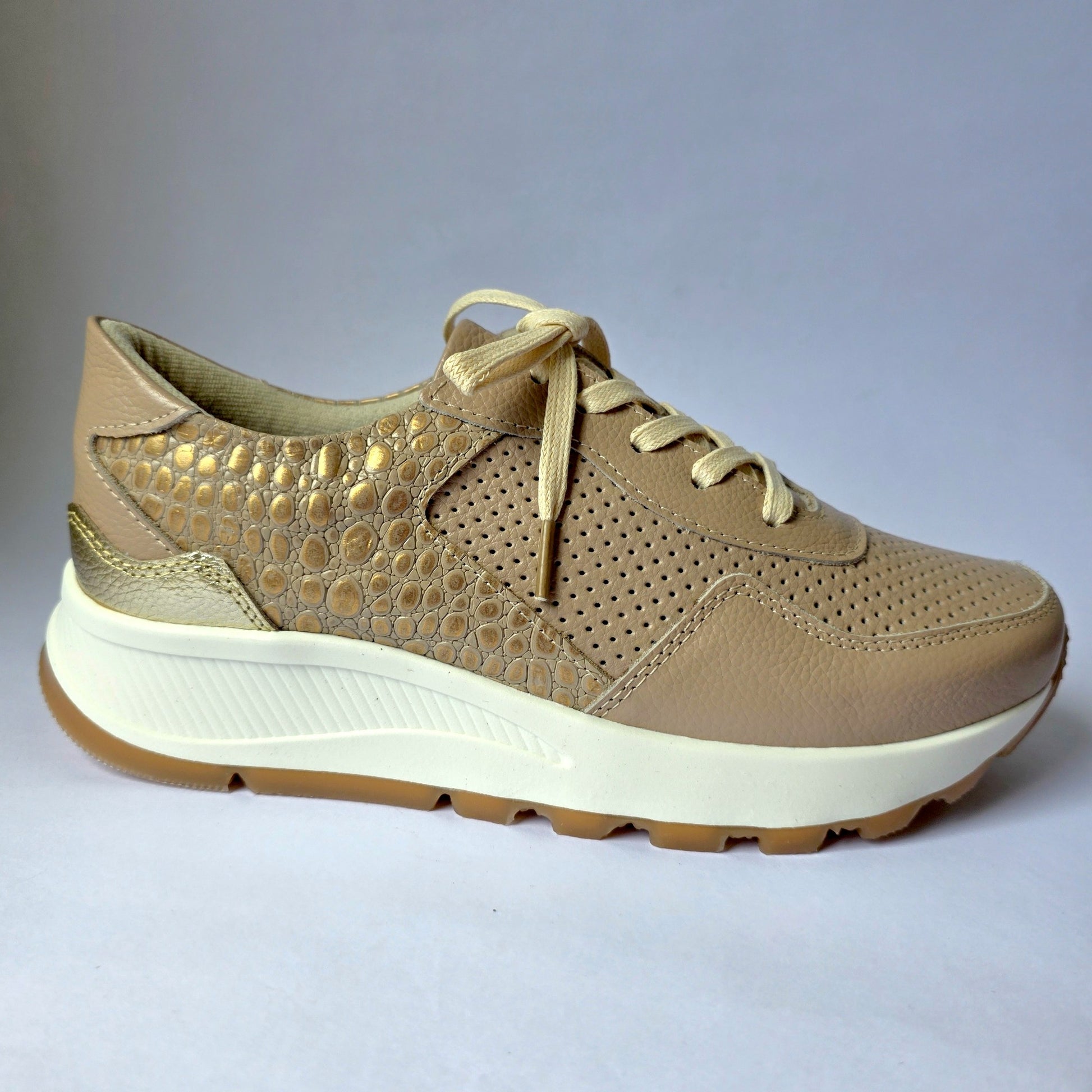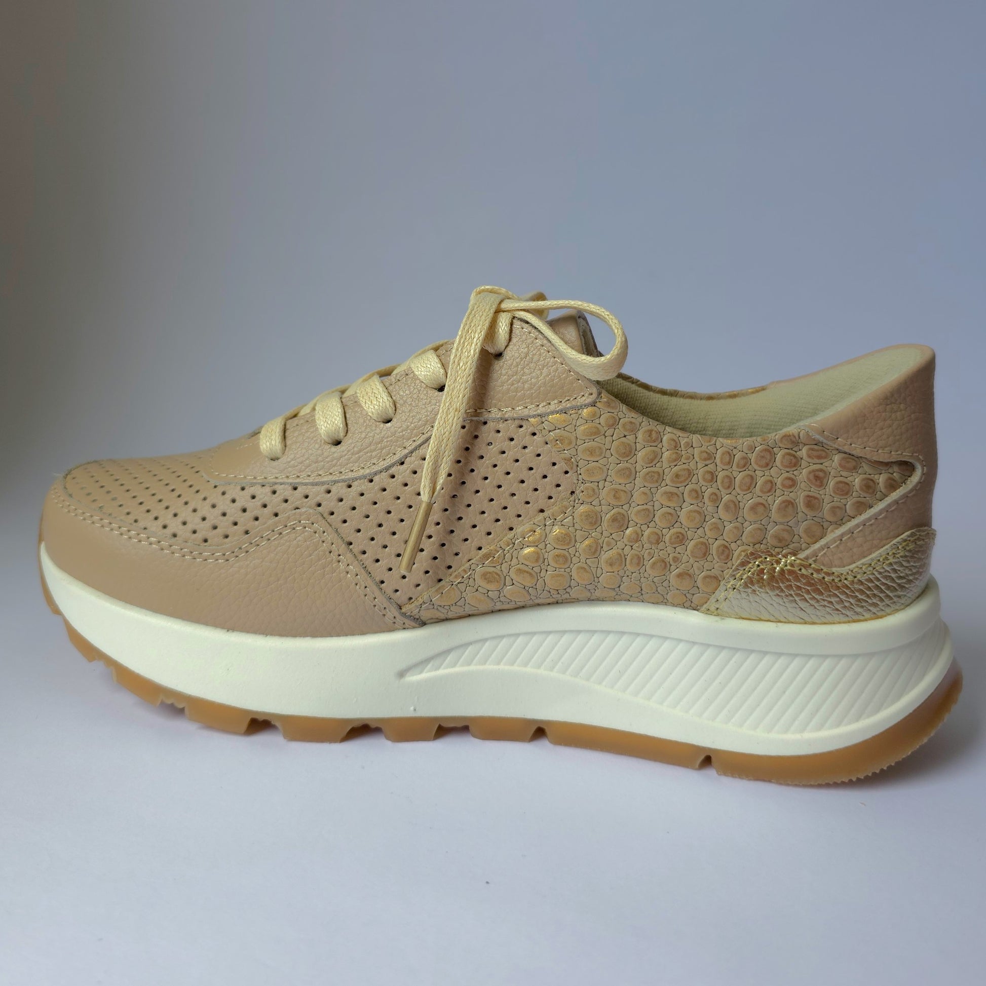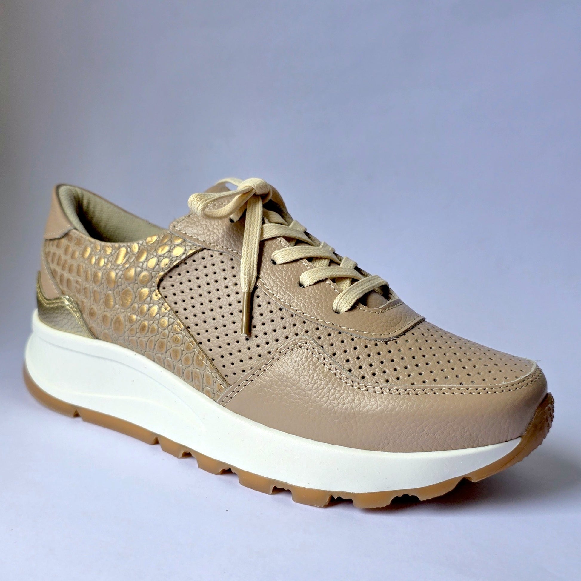 Resalta tu estilo con estos tennis de cuero taupe / Nude con detalles dorados que combinan modernidad y elegancia en un solo diseño.
