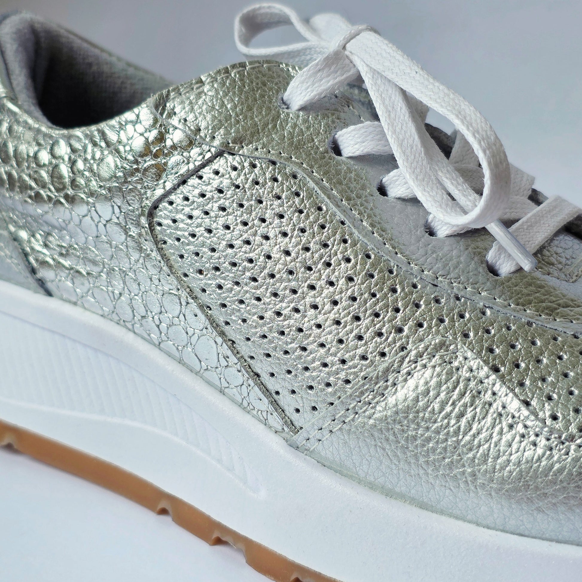 Atrevete a destacar con estos tenis en acabado metálico plateado, elaborados en cuero de alta calidad con textura microperforada para mayor frescura.